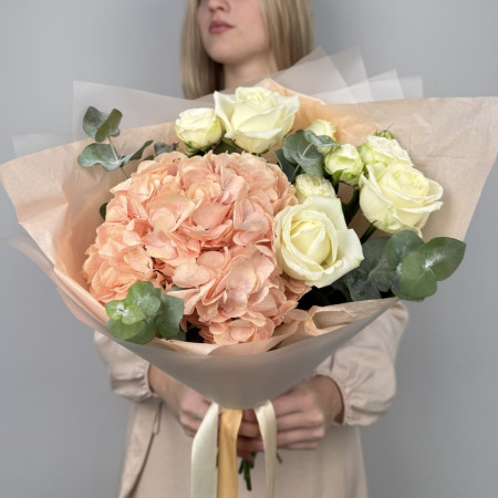 Современная упаковка - 1;Лента атласная - 1;Хризантема кустовая розовая - 3;Роза кустовая пионовидная - 4;Львиный зев - 2;Эвкалипт большой - 1;